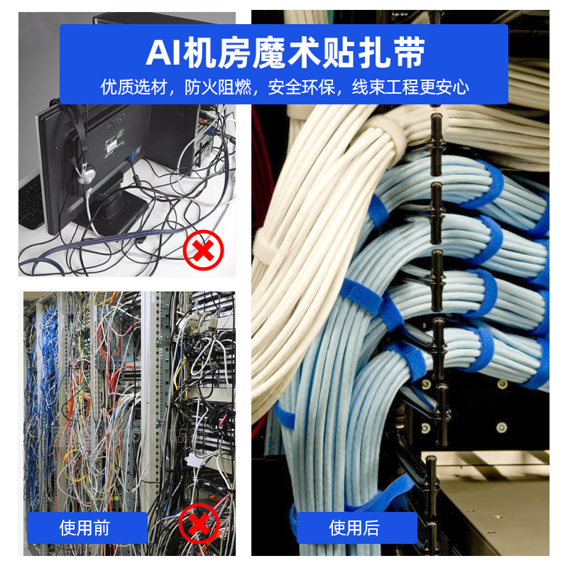 人工智能与数据中心行业:适配大型AI算力中心、云计算数据中心、边缘计算机房的高密度布线需求,依托魔术贴扎带高稳定性适配机房24小时运行场景。
